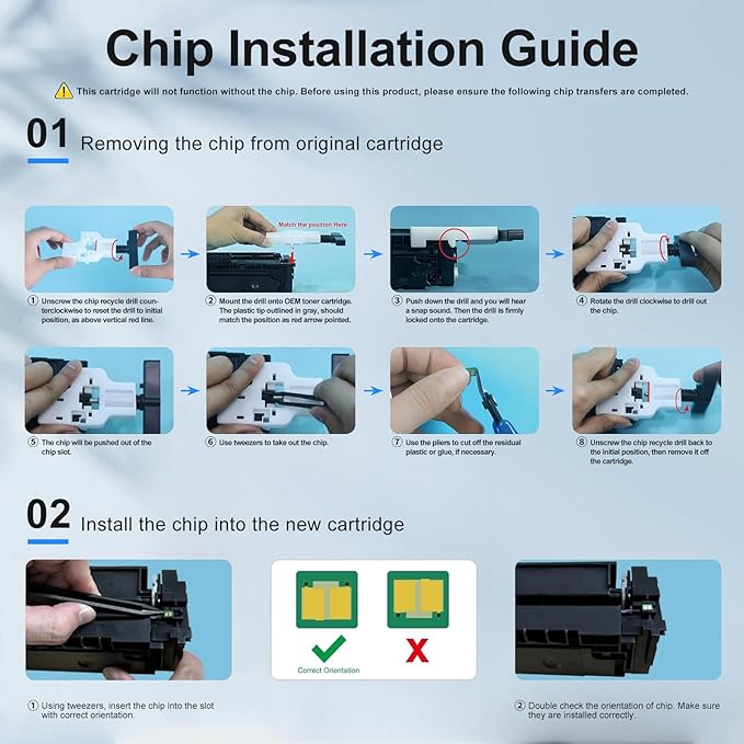 - NO Chip: These compatible hp 218a toner cartridges do not have chip. Please transfer chip from original 218A/218X toner. Follow user instructions and use provided tools to install it. Detailed Instructions Please Check this Product Page for Pictures & Videos