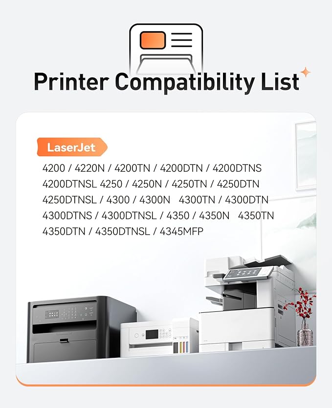 - Compatible Printer: Compatible with HP LaserJet 4200 4220N 4200TN 4200DTN 4200DTNS 4200DTNSL 4250 4250N 4250TN 4250DTN 4250DTNSL 4300 4300N 4300TN 4300DTN 4300DTNS 4300DTNSL 4350 4350N 4350TN 4350DTN 4350DTNSL 4345MFP Series Printer.