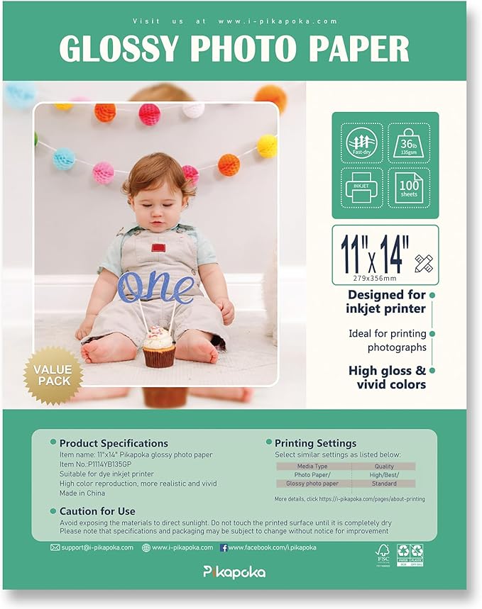 - Pikapoka thin glossy photo paper 36lb(135gsm), size: 11x14 in, 100 Pack