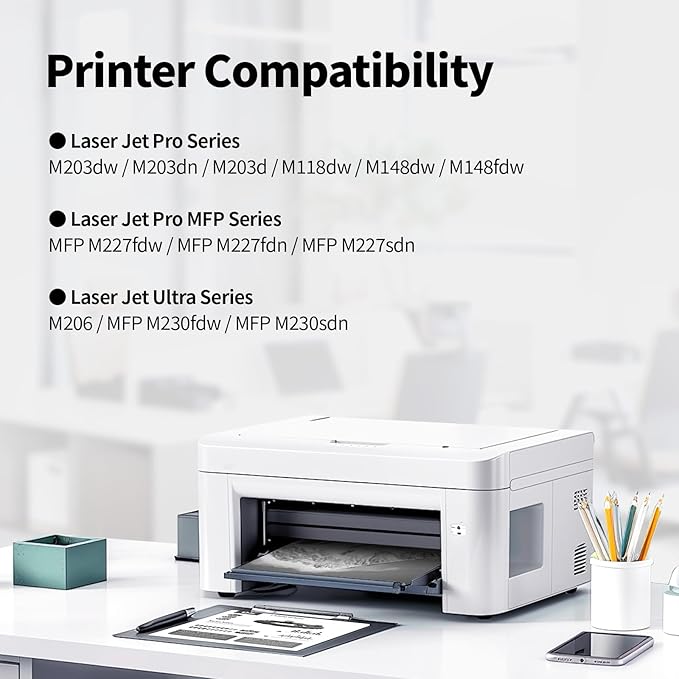 - Printer Compatibility: Laser Jet Pro Series: M203dw / M203dn / M203d / M118dw / M148dw / M148fdw; Laser Jet Pro MFP Series: MFP M227fdw / MFP M227fdn / MFP M227sdn; Laser Jet Ultra Series: M206 / MFP M230fdw / MFP M230sdn