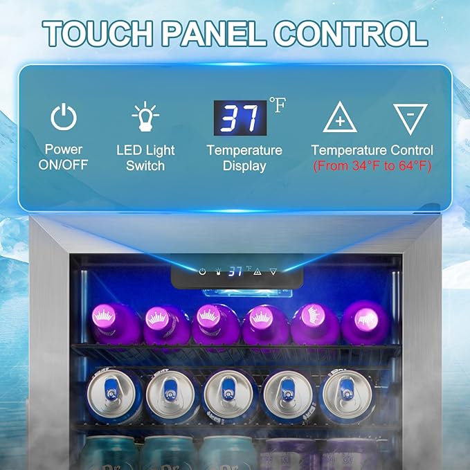 - SMART TOUCH CONTROL PANEL: The mini beverage fridge comes with an intuitive touch panel for effortless temperature adjustment, perfectly suited for modern lifestyles. With a wide temperature range (34 °F–64 °F), you have full control over your cooling experience