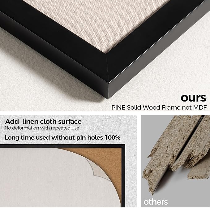 - Pine Frame Material: Our cork boards for walls is made of 100% pine wood which has well self-healing ability and repairability. The pin board features a four-ply splint design that is strong and thick enough not to be punctured by thumbtacks.