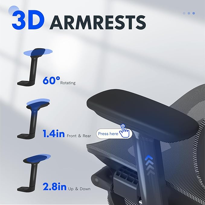 - 3D Armrests: Fully adjustable armrests (height, forward/back, and swivel) allow for precise positioning to reduce arm strain during extended use.