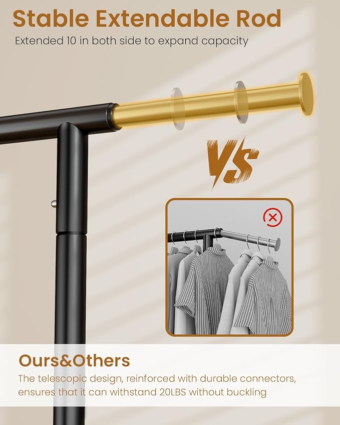 - ๐ผ๐ฟ๐ ๐๐๐๐ผ๐ฝ๐๐ ๐๐๐๐๐๐: The heavy duty clothes rack features a user - friendly adjustable design. The horizontal rod extends from 43in to 63in. This adaptability makes it perfect for any space such as living room, bedroom, laundry, yard sales, clothing live streaming, shopping malls and so on.