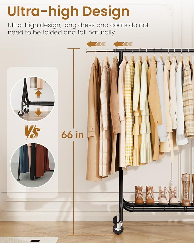 - ๐๐๐๐๐ฟ๐ ๐ผ๐๐ฟ ๐๐๐ผ๐ฝ๐๐ ๐พ๐๐๐๐๐๐๐พ๐๐๐๐: Our clothes rack adopts an innovative one-piece rod design, which ensures that the clothing rack are evenly supported, preventing sagging or bending. The triangle on the sides and dual U-shade rods on the bottom make the heavy duty clothing rack more stable and sturdy. The rolling rack can hold up to 450 pounds, so you can hang up heavy clothing, place luggage and more without worry.