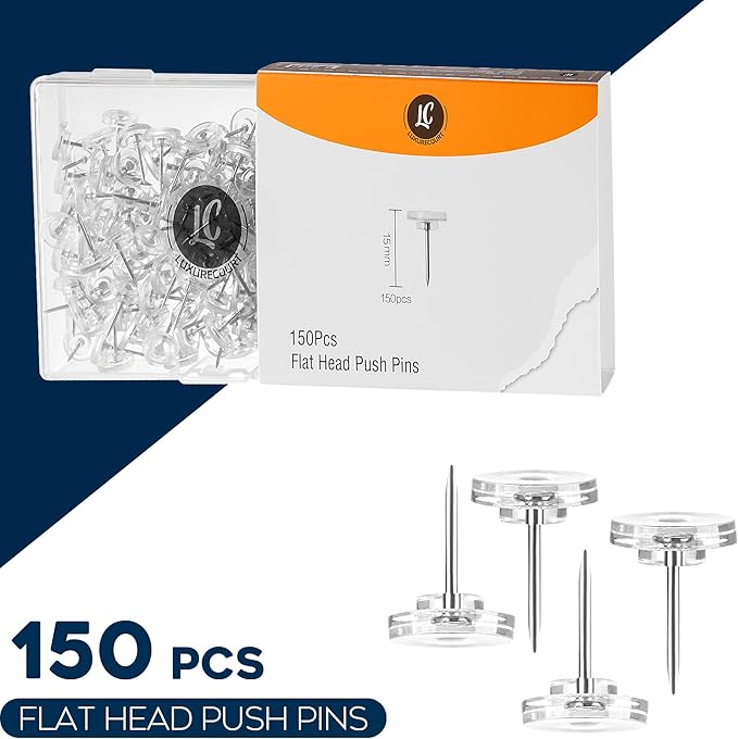 150 Pack Clear Push Pins Tacks by Luxurecourt, Flat Head Thumbtacks for Bulletin Board, Wall Hanging, Cork Board, Shadow Box, Heavy Duty Plastic Head with Steel Point in Reusable Storage Box.