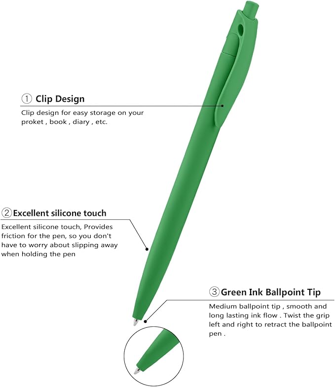 - 【Smooth writing experience】: The Retractable design ensures that these ballpoint pens have green ink ready to use at any time. The green ink color produces clear text, making it easy to read. The pen tip slides effortlessly on paper, providing a smooth and enjoyable writing experience that will make any task more comfortable.
