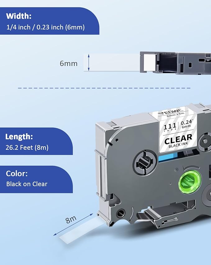 - Package Included: 4 Pack Replacements for Brother Ptouch label maker tapes black on clear TZe-111. Dimensions: Each pack measures 1/6" (0.23") in width and 26.2 ft (8m) in length, totaling 48 meters across all packs.