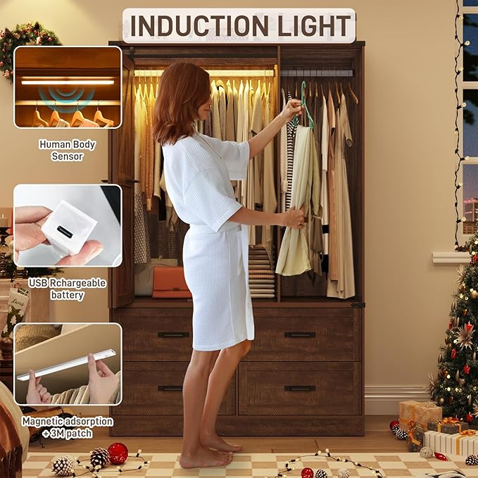 - 3 Door Wardrobe Closet with Motion Sensor Light: Our led wooden wardrobe closet come with induction light which will turn on automatically when you get within 120° and 16 feet, allows you to choose your clothes conveniently whether at night or low light environment.The light could be chargeable by usb cable which included in package. Auto/On/Off 3 modes available for different occasions which more bang for your buck than other closet.