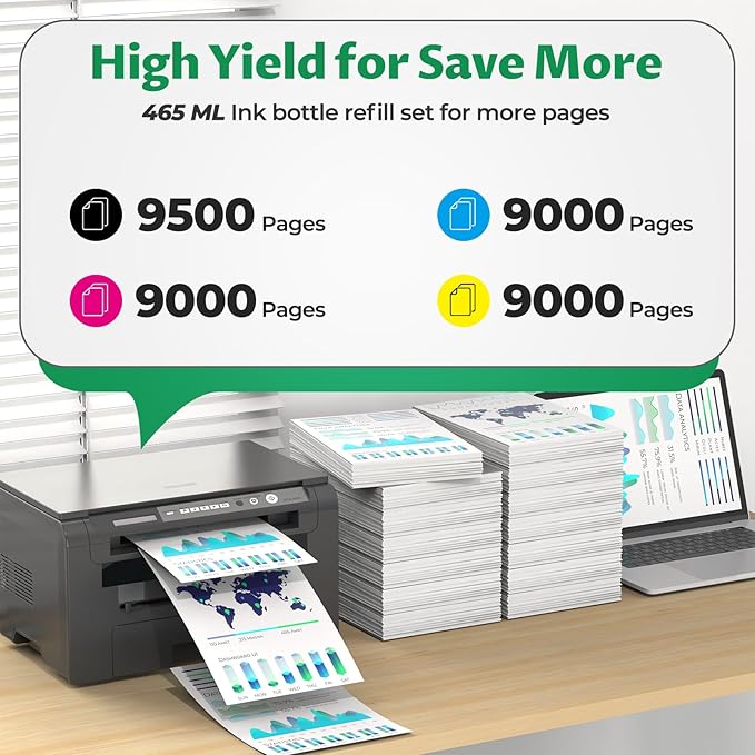 - Higher Page Yield: The page yield of our 32xl black ink bottle refill is up to 9500 pages, the 31 cyan ink bottle is up to 9000 pages, the 31 magenta ink is up to 9000 pages, the 31 yellow ink refill bottle is up to 9000 pages at 5% coverage on A4 paper.