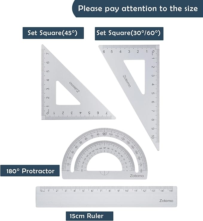 - COMPLETE SET: 4-piece geometry set includes two triangular rulers, one 15cm straight edge ruler, and one aluminum protractor for all your measuring needs