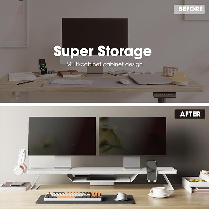 - 【All-in-One Workstation】Fenge desk shelf innovatively combines dual monitor stand with phone stand and headphone holder, meets the needs of multi-device office work. The second shelf (16.5”L×2.1”H ) stores office accessories, maximizes space for a clean, efficient workstation.