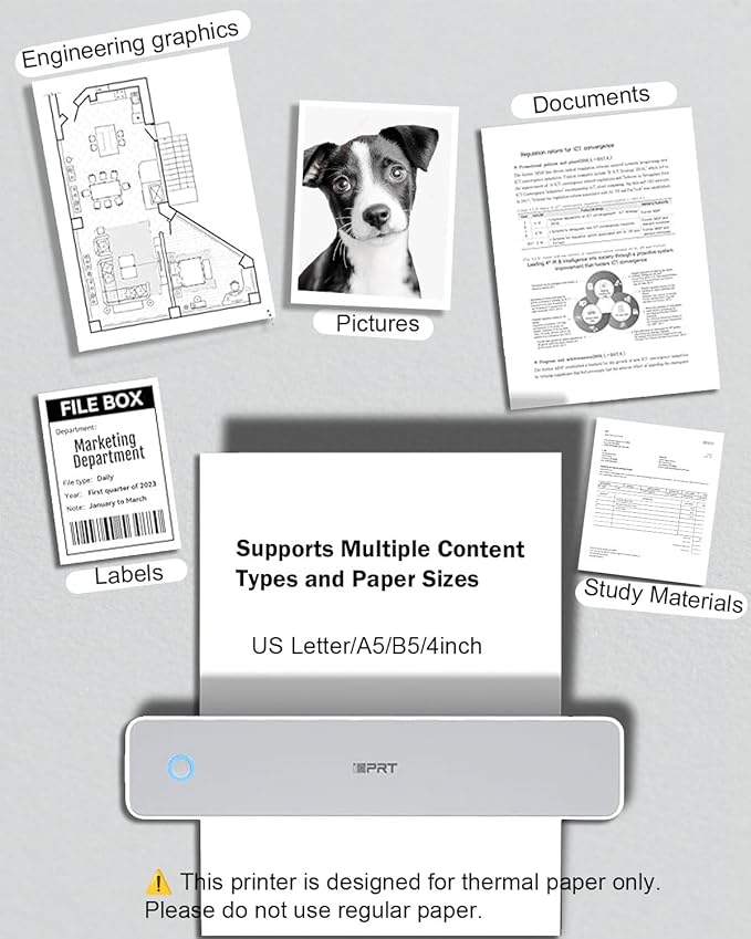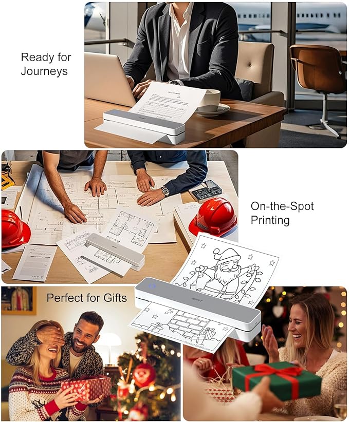 - Gift Worthy Printer for Work or Study:This compact thermal printer supports US Letter/ A4/ A5/ B5 / 4-inch paper sizes. Print PDFs, notes, receipts, and reports on demand. Ideal for students, digital nomads, field professionals, or anyone needing portable printing—makes a practical and thoughtful gift too.