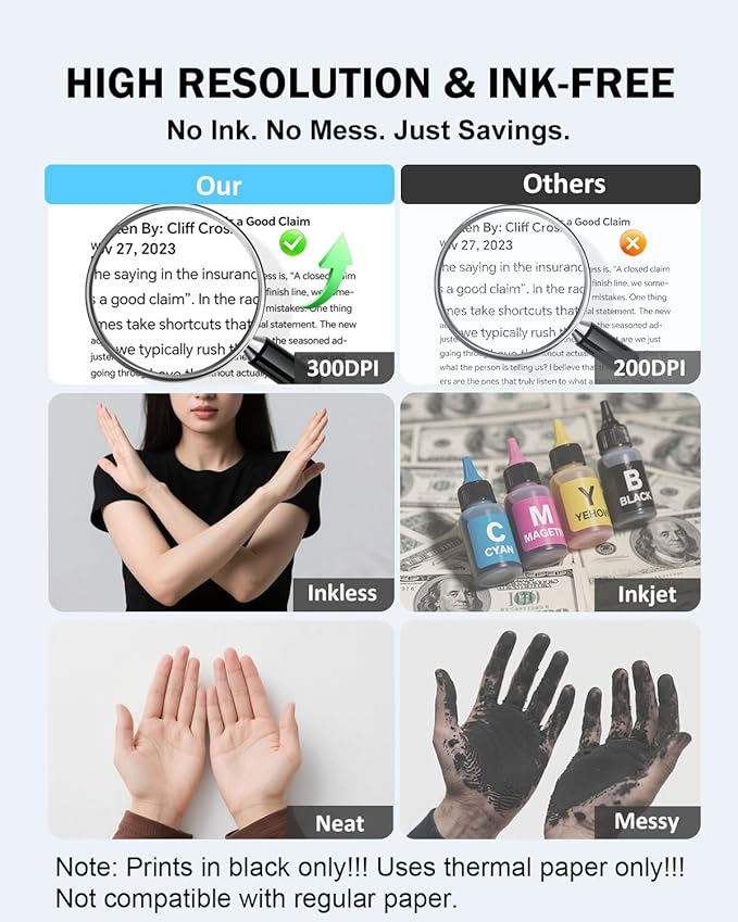 - Inkless Thermal Printer – No Ink, No Mess! Say goodbye to cartridges and toner! The iDPRT 610Pro portable printer uses advanced thermal technology for clean, cost-effective, 300DPI printing—anytime, anywhere. Includes: printer, 10 sheets thermal paper, USB-C cable & free app.(⚠️ Only compatible with black & white thermal paper. Not for inkjet/laser paper).