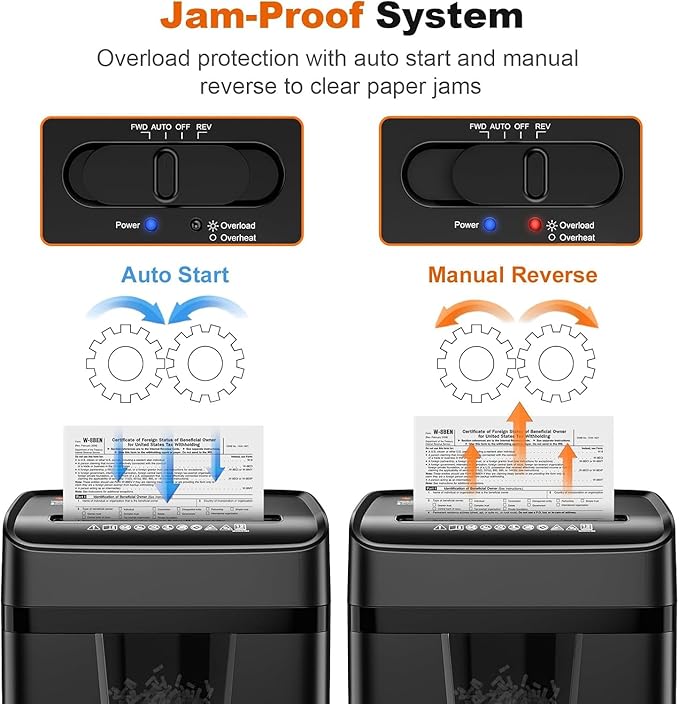 - Anti-Jam Technology: Equipped with auto start/stop and a manual reverse function ("REV"), this shredder prevents jams and lets you retrieve accidentally inserted documents quickly and safely