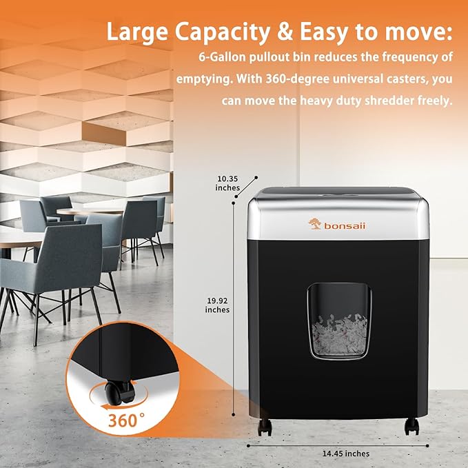 - Auto & Manual Shredding: 110 sheets automatic shredding (paper only) and 12 sheets manual shredding capacity (mail, cards, staples).