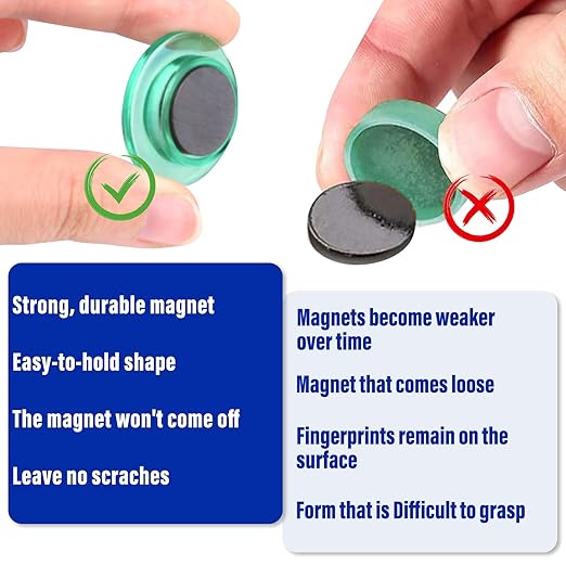 - Durable Magnet: Our strong whiteboard magnets are very durable and can be used for a long time. It has a larger magnetic contact surface that holds better and is more durable than other neodymium magnets. These small magnets are sturdy, cute, stylish and add a pop of color to your decor. Colored magnets can be used on any magnetic surface such as refrigerators, whiteboards, lockers, bulletin boards, etc. If you want to attach heavier items, be sure to use 2+ fridge magnets.