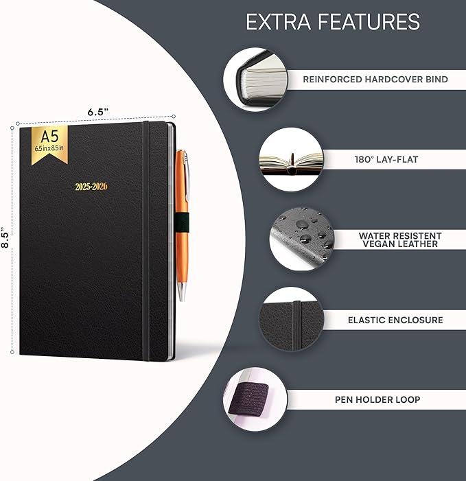 Ensight 2025-2026 HARDCOVER Leather Planner Weekly & Monthly - 6.5x8.5 Inches - Academic Planner Business Personal or Student - Pen Holder, Thick Paper, July 2025 - June 2026 (Black)