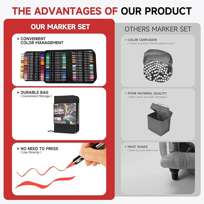 - 【CONVENIENT STORAGE & CLASSIFICATION】Unlike traditional box sets, our acrylic paint markers come in a stylish carrying case with an organized layout. Each marker is securely stored in a separate compartment, making it easy to find the right color quickly. The lightweight, portable design makes it convenient to carry your markers wherever you go, perfect for artists, crafters, and DIY enthusiasts who love to create on the go.