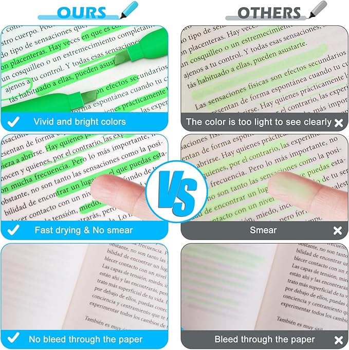 - Fast Drying & Durable: The highlighters pens use durable, quick-drying ink, allowing highlighted marks to be clearly visible without worrying about the ink staining your hands and books. Each highlighter is equipped with a pen cap to avoid ink from drying out for long-lasting use. Please remember to be sure after use keep the pen cap closed to prevent the ink from drying out.