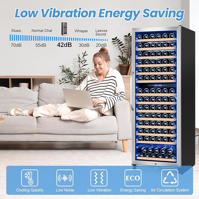 - ENERGY-EFFICIENT COOLING SYSTEM: Powered by a robust compressor and convection cooling fan, this wine cellars cools quickly while keeping energy consumption low, and maintains internal temperature coordination. Its ultra-quiet operation ensures your rest is undisturbed, making it a perfect addition to any home or space.