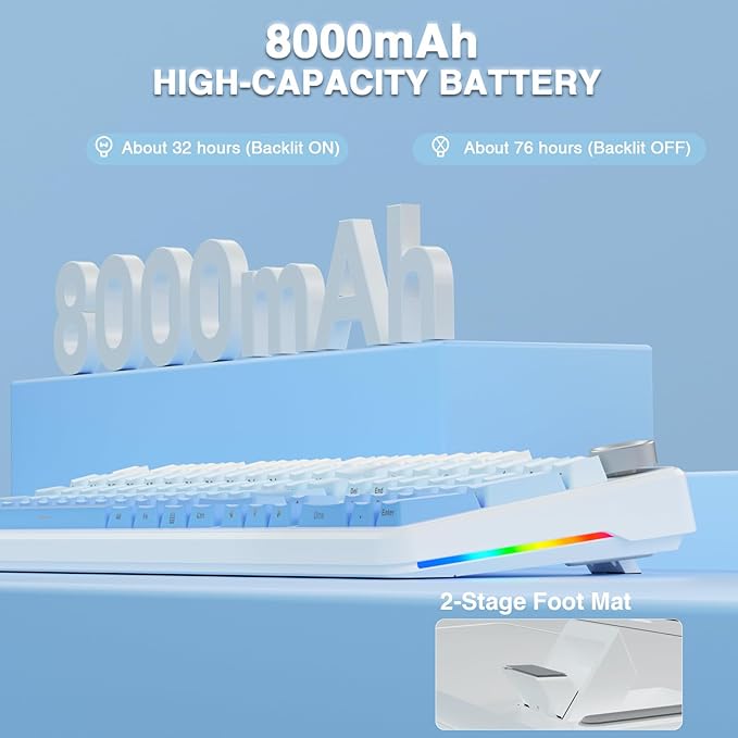- 104 Keys Full Size Keyboard: The F108 Pro computer keyboard features a newly upgraded 100% full-size layout with arrow keys, function keys, and numeric zones for a more comfortable and productive office. The two-colour injection-moulded PBT keycaps are more durable without fading, sweat-proof, and softer to the touch. Built-in 8000mAh high-capacity battery, the creamy keyboard with number pad is suitable for long-time work or high-intensity gaming