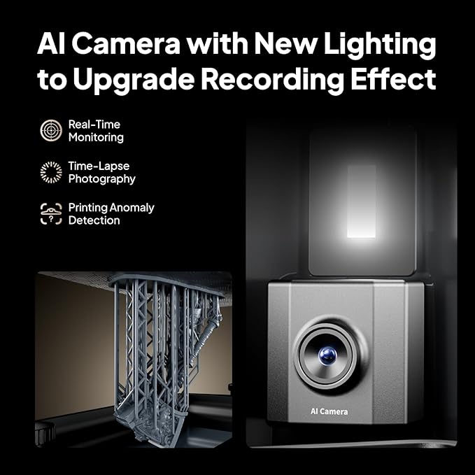 - 【Built-in AI Camera and Light】The AI camera in ELEGOO Saturn 4 Ultra 16K 3D printer can intelligently detect problems such as empty build plate and model warping, so that you can view in real time, and promptly discover and solve printing problems. Additional high-brightness lighting illuminates the printing process and enables clear monitoring