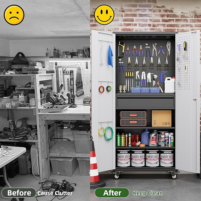 - 【 High-Quality Metal】Garage storage cabinet with Wheels is made of high-quality steel, with a high-temperature curing and hardening layer, an anti rust treatment layer, and an environmentally friendly powder electrostatic coating process,They have strong load-bearing capacity.