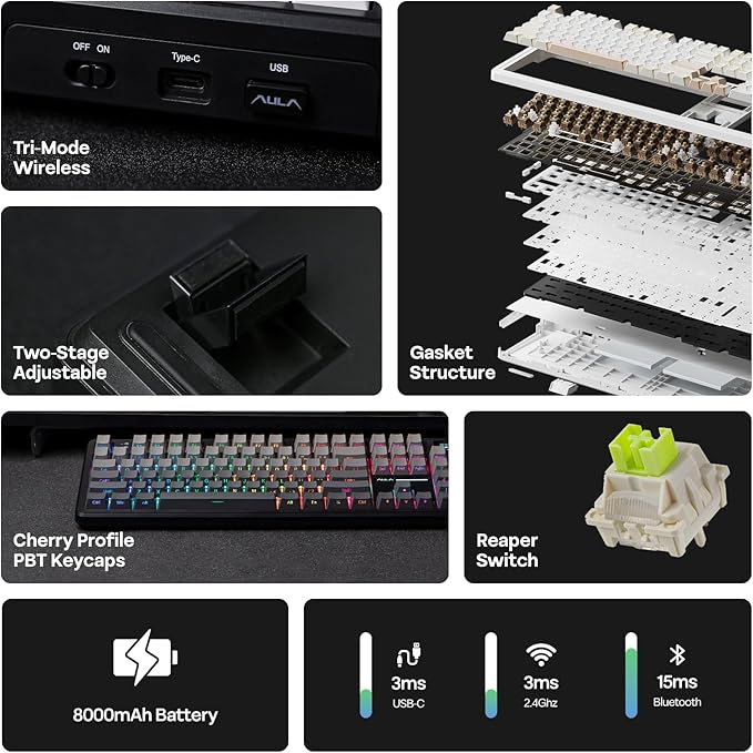 - Acoustic Mastery with Satisfying Creamy Sound: Boasts a five-layer sound and shock-enhancement internal design, the F108 PRO keyboard brings the satisfying tranquil switch asmr to your desk. The sophisticated interior layer design features PO Sandwich Foam, PO Switch Pad, PET Sound-Enhancement Pad, PO Bottom Foam and Bottom Silicone as shock absorber and muffler, reducing typing noise and resonance for hushed and quiet switch sound, exceptional for focused tasks at office and immersive gaming at home