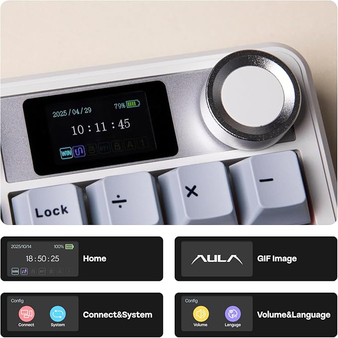 - Customizable Screen & Volume Knob: Perfect for work with a dedicated numpad and premium ergonomic typing experience, the F108 PRO features a customizable screen and convenient knob that get the keyboard stands out among other gasket mechanical keyboards. Not just for show, this 1.14-inch LCD screen works as an intuitive control hub for RGB adjustment, displaying keyboard’s vital information, and double as the space for you to bring out your uniqueness with powerful software. Whether you’re crunching numbers, typing reports, engaging in group chat discussions, the F108 PRO keyboard elevates your workspace efficiency and aesthetics with productivity, comfort and creativity