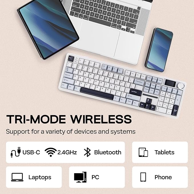 - Wireless Keyboard with Limitless Compatibility: Packed with an incredible 8000mAh rechargeable batteries, double the power average gaming keyboard offers, F108 PRO Wireless Keyboard grants up to 76 hours of continuous gameplay at peak performance with screen displaying at full brightness. Its versatile Bluetooth mode offers swift transaction from PC, Mac Laptop to Android Tablet, while the 2.4GHz wireless and USB Cable mode promise competitive-level stability and responsiveness with 1000Hz polling rate