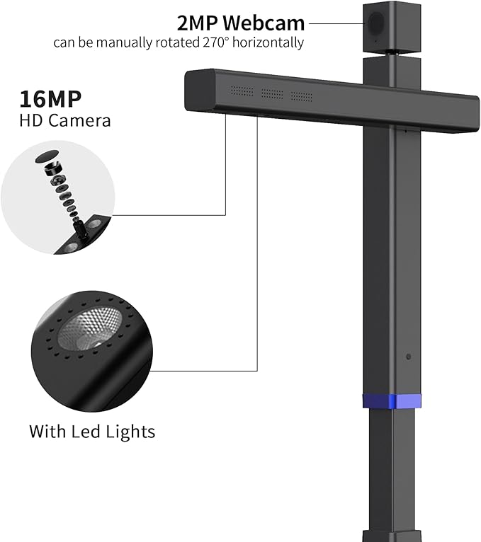 - Top Rotatable Webcam: There is a 2MP webcam on the top of the scanner that can be manually rotated 270°, it can help you capture your face while using a visual presenter or recording a video (you need to download the software "CZUR Camera" instead of "CZUR Scanner")