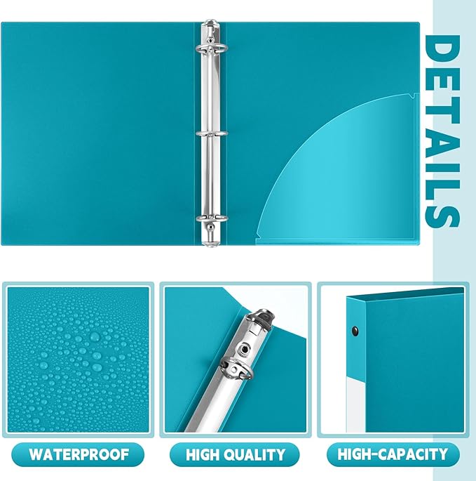 Henoyso 36 Pcs 3 Ring Binder 1/2'' Round Fits Letter Size 8. 5'' x 11'' Paper Plastic Flexible Binder Holds 100 Sheets with 1 Pockets Versatile Organizer for Office Home School (Turquoise)
