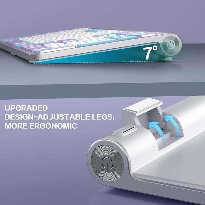 - 【Stylish Pastel Aesthetic & Color Therapy Design】Elevate your workspace with soft blue, lavender, and white gradient keys on a sleek silver frame. This modern color-blocked design creates a calming visual experience that reduces eye strain during long typing sessions.Visually striking white/blue/purple keycaps enhance key recognition while elevating desk aesthetics.
