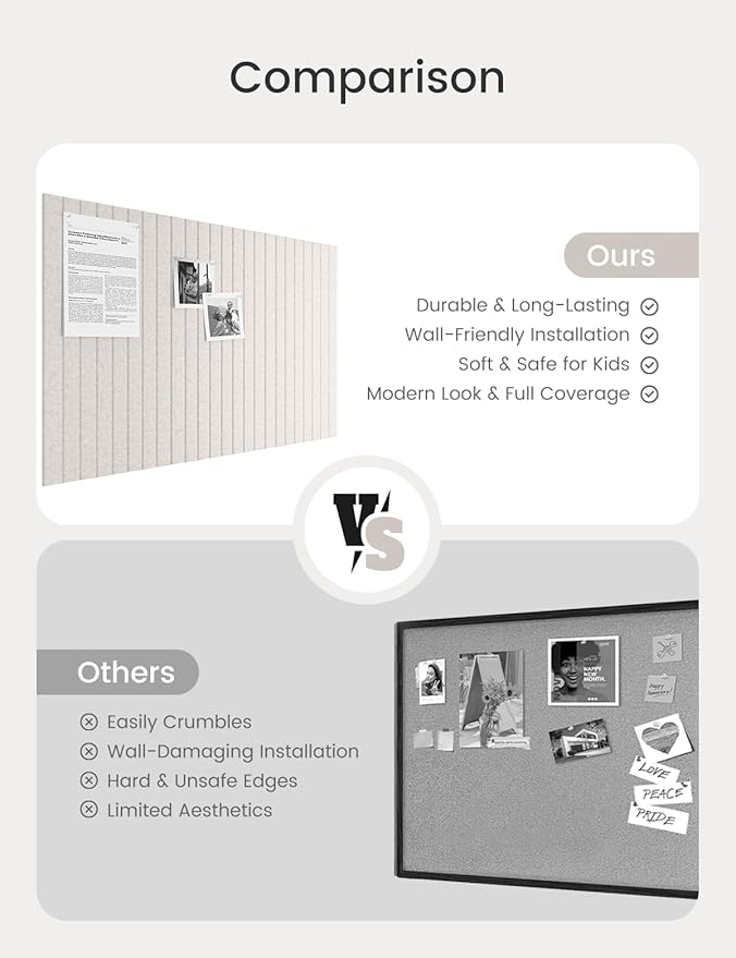 - 【Felt Bulletin Board – 6 Tiles Included】 Includes 6 felt cork boards (each 11.8" x 11.8") with 30 Pushpins that can be freely arranged into a large display board. Perfect for showcasing your schedules, ideas, and creations in home or office settings.