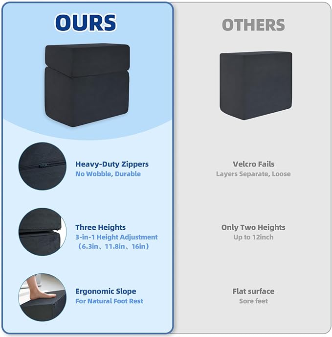 - [3-IN-1 HEIGHT ADJUSTMENT] Customize your footrest to 6.3" (16cm), 11.8" (30cm), or 16" (41cm) with a simple detachable design—perfect for any body type, chair height, or space. Stack layers for elevated leg support or remove tiers for a compact fit under desks, sofas, or gaming setups. Reduce leg fatigue and improve posture during work, relaxation, or long gaming sessions.