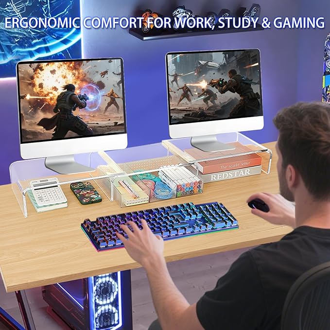 - 【Space Saved】Transparent acrylic monitor riser visually expands your workspace. Open space below offers ample storage for office accessories. See-through surface lets you spot items instantly—no digging. Keep your desktop neat and clutter-free for optimal desk organization