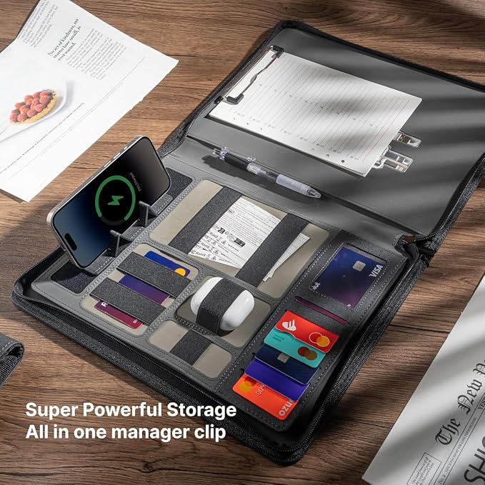 CARDSILK, Leather Zipper Portfolio Binder with Wired Charging, Clipboard – Business Organizer Padfolio folder with Built-in Power Bank, Tablet Slot, Zip Up Binder & portfolio clipboard for Women/Men