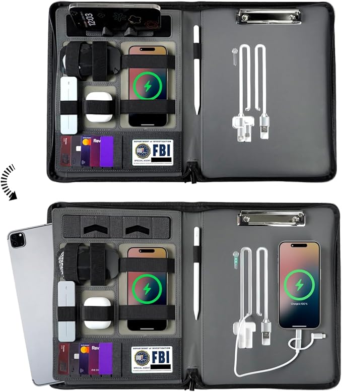 - Wireless/Wired Charging Padfolio – This zippered leather business portfolio padfolio features a built-in 8000mAh portable charger, offering around two full charges for devices like the iPhone 15 Pro, or iPhone Xs. It supports wireless charging for compatible phones, and wired charging via USB, Lightning, and Type-C output ports—making it a reliable business padfolio for both Android and iPhone users.
