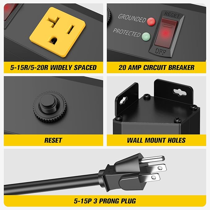 - Garage power strip Output rating - 125V/20Amp/2500W. The shop power strip come an ON/OFF switch. Built-in 20A circuit breaker, With 15 gauge 5-15P extension cord, power strips with 4800J surge protection, 5-15R/5-20R T-Slot adapter for more appliance