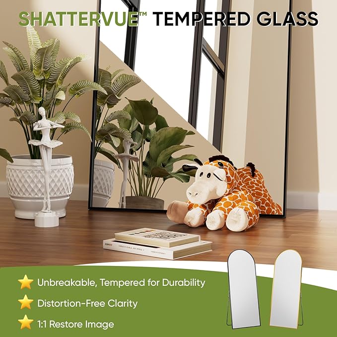 - Shatter-Resistant Glass - Our full length mirror engineered with a weighted, stable base to prevent tipping, ideal for homes with kids or pets. What sets it apart is the special explosion-proof material used, which ensures that even if accidentally damaged, the glass will not scatter all over the floor