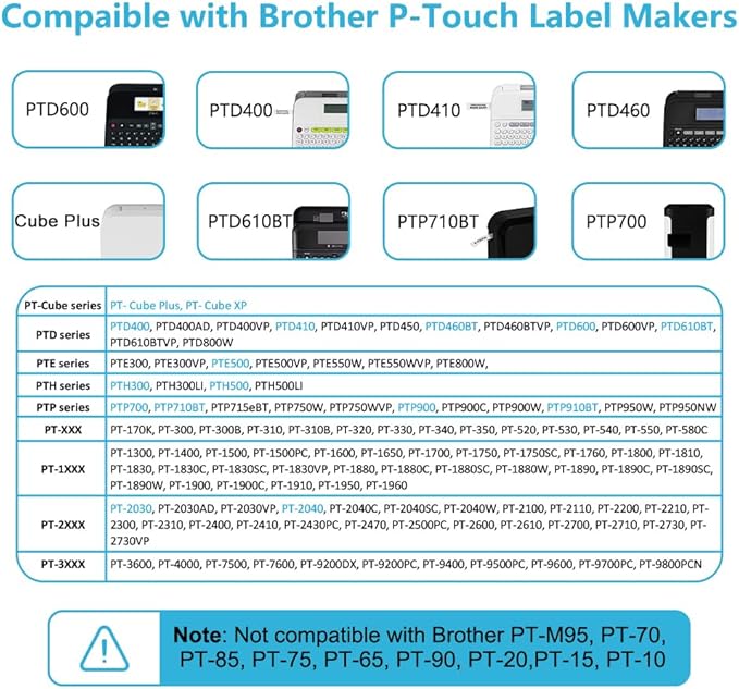 - Compatibility: Works with Ptouch label makers including PT-D/PT-P/PT-E/PT-H series (PTD400, PT-P710BT, PT-E550W, PT-H500LI, etc.) and PT series models (PT-1800/1900/2040, etc.)
