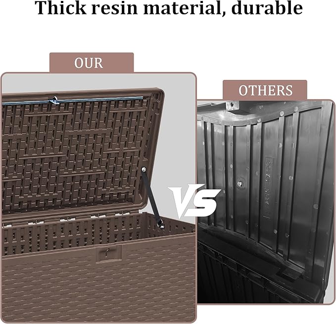 - Built to withstand any weather, our deck box is made from resin that offers waterproof, corrosion-resistant protection, and UV-resistant. No matter the season—be it scorching sun or heavy rain—this box will keep your items dry.