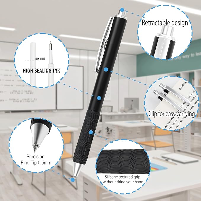 - 5-SMOOTH WRITING: (Recyclable) Smooth Writing Pens. Designed with a high-precision nib ball, each pen comes with an ultra-precise 0.5 mm fine nib that delivers crisp, sharp lines for detailed notes, intricate sketches, and perfect handwriting that won't bleed or bleed.