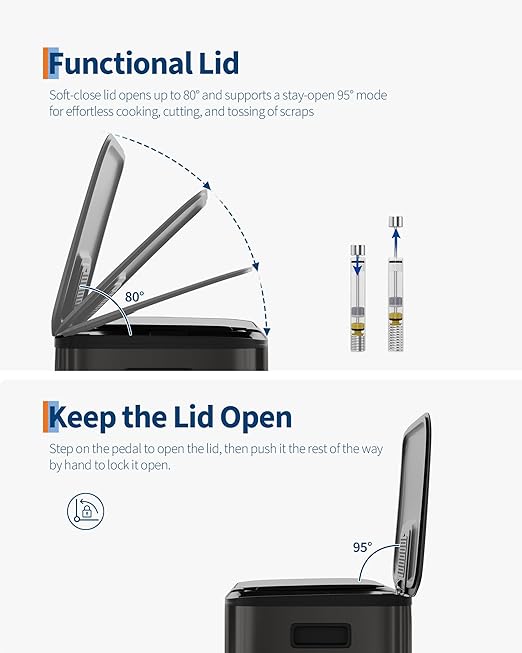 - [PRACTICAL DESIGN] – GarveeHome’s dual trash and recycling bins put ease of use first. Ergonomic side handles let you lift and relocate the entire unit effortlessly. The soft-close lid opens to 80° without collision with standard kitchen island edges, and locks at 95° for hands-free cooking prep and scrap disposal. Dual inner buckets with weighted-edge lids trap odors separately. A custom liner ring secures any standard bag snugly, eliminating slips, bunching, and overhang
