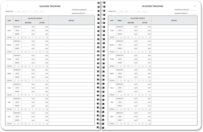 - Weekly overview: Each page is designed to capture a week's worth of data, making it easy to see trends and patterns in your glucose readings. You can also track your weight at the beginning and end of each week to monitor overall health trends.