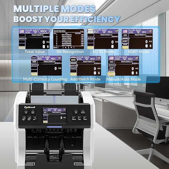 - Boost Your Efficiency: NEW Upgraded Bill counter machine mixed denomination counts and reports total value, clear breakdown of quantity and value by Denom, and serial number. The machine is low noise and durable. The user-friendly TFT touch screen with key buttons makes your cash counting job as easy as possible. The upgraded accessories makes the counting process smoother. Ideal for grocery stores or casinos to deal with heavy cash-counting jobs.