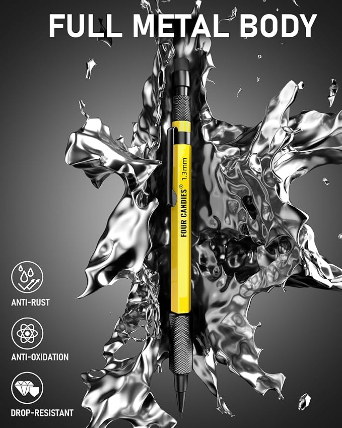 Four Candies 1.3mm Mechanical Pencil Set with 72 Lead Refills, 3PCS Metal Weatherproof Body Heavy Duty Carpenter Pencil, 3 Eraser, 16 Eraser Refills, for Outdoor Woodworking Drafting Marking with Case