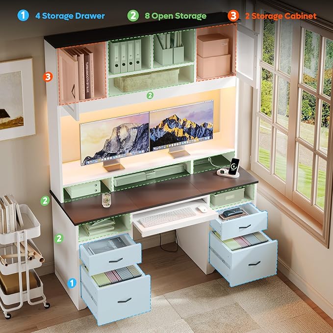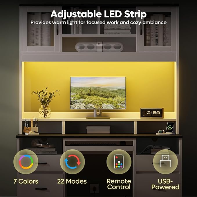 Bestier 77.8" H Executive Desk with Hutch, Modern Wood Computer Desk with Drawers, Charging Station, LED Light, Fluted Storage Cabinet, Keyboard Tray, 59" W Office Desk for Home Office, White