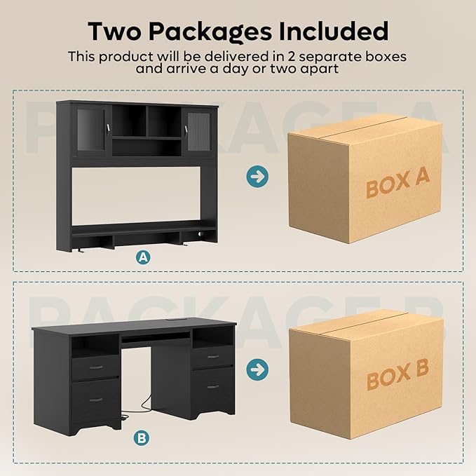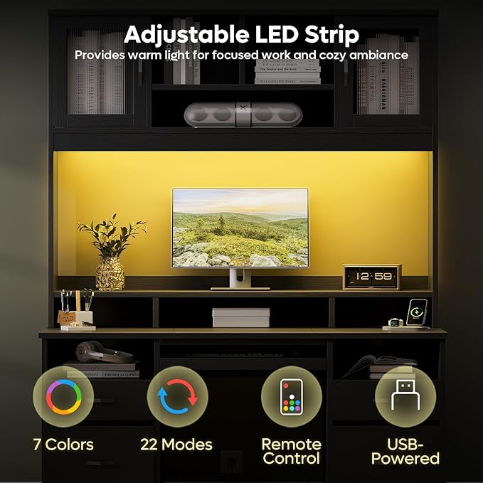 Bestier 77.8" H Executive Desk with Hutch, Modern Wood Computer Desk with Drawers, Charging Station, LED Light, Fluted Storage Cabinet, Keyboard Tray, 59" W Office Desk for Home Office, Black